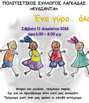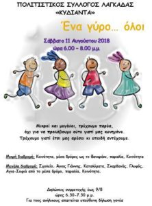 Αγώνα δρόμου για μικρούς και μεγάλους γύρω από το χωριό με τη μικρή διαδρομή να ξεκινά από τα γραφεία της Κοινότητας και τη μεγάλη από το Δημοτικό Σχολείο, διοργανώνει το Σάββατο 11 Αυγούστου στις 6.00 μ.μ. ο Πολιτισιτκός Σϋλλογος Λαγκάδας “Η Κυδιάντα”.