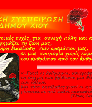 Όλα αυτά τα παιδιά τα απαλύνει το «Νανούρισμα» του Αγγουλέ.”, σημειώνει ο επικεφαλής της Λαϊκής Συσπείρωσης στο κείμενο που συνοδεύει τις αγωνιστικές ευχές της ΛΑΣ Δήμου Χίου.