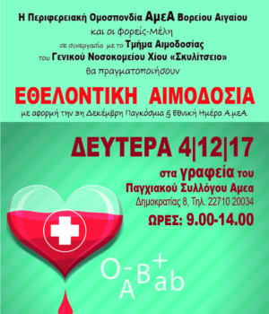 Τη Δευτέρα 4/12 σε συνεργασία με το Τμήμα Αιμοδοσίας του Γενικού Νοσοκομείου Χίου θα πραγματοποιηθεί εθελοντική αιμοδοσία στο γραφείο του Παγχιακού Συλλόγου Α.μεΑ. στην οδό Δημοκρατίας από τις 9.00 το πρωί έως τις 2.00 μετά το μεσημέρι.