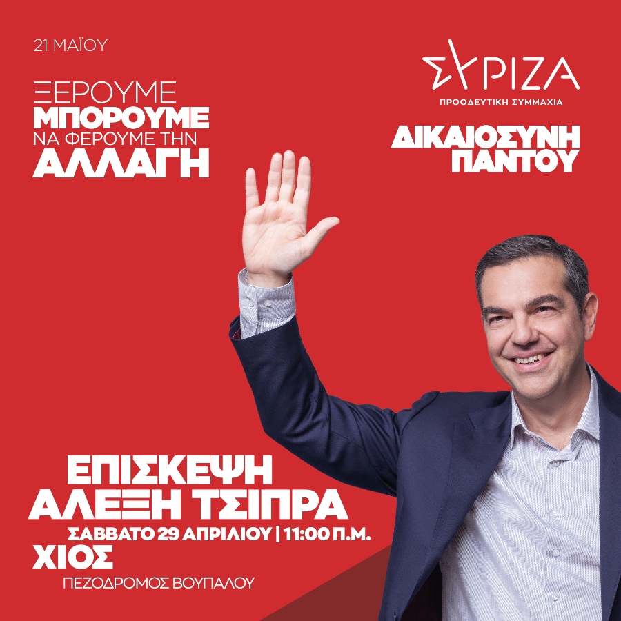 Το πρωί του Σαββάτου, 29 Απριλίου 2023, θα βρίσκεται στη Χίο ο Αλέξης Τσίπρας.
