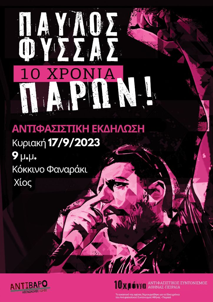 Με αφορμή τη συμπλήρωση των 10 χρόνων από τη δολοφονία του Φύσσα καλούμε σε μια αντιφασιστική βραδιά την Κυριακή 17 Σεπτέμβρη στις 9.00 μ.μ. στο Κόκκινο Φαναράκι στο λιμάνι της Χίου για ενημέρωση, συζήτηση και με μουσική με τον Κουπεπέ στα deck.