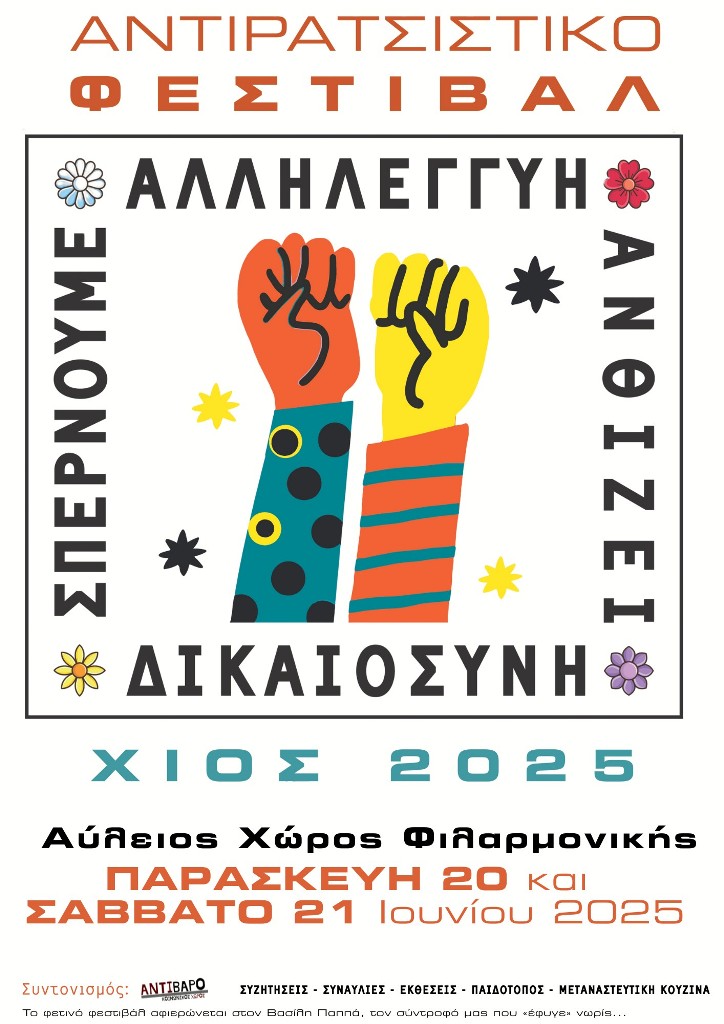 Ο Βασίλης ήταν εκείνος που το 2023, μετά τα δύο χρόνια κλεισούρα λόγω πανδημίας, έριξε την ιδέα, σε μια συνέλευση στο Αντίβαρο, μήπως να ξεκινάγαμε ξανά τα Αντιρατσιστικά Φεστιβάλ. Κι έτσι έγινε, έτσι γράφτηκε ιστορία. Βασίλη, ευχαριστούμε, είσαι πάντα παρών”, καταλήγει η ανακοίνωση του Αντιρατσιστικού φεστιβάλ Χίου που θα πραγματοποιηθεί στον Αύλειο Χώρο της Φιλαρμονικής, Παρασκευή και Σάββατο, 20 και 21 Ιουνίου .