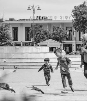 Δίπλα ηλιοκαμένα τσιγγανάκια, “έδιναν παραστάσεις” για ένα παγωτό και μια έγκυος νεαρή προσφυγοπούλα με την καρώ μαντήλα της όλο χαχανητά, κυνηγούσε ανέμελη περιστέρια “ελευθερίας” μαζί με τους δύο της γιους και άλλο ένα παιδί στην κοιλιά. Δεν έδειχνε να σκέφτεται ότι σε λίγες μέρες μπορεί να βρίσκονται κλεισμένοι και οι τέσσερις σε μια φυλακή με το εύσχημο όνομα “Προαναχωρησιακό Κέντρο”