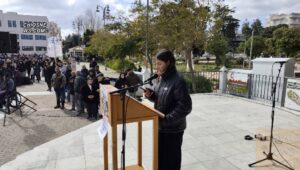 εκπρόσωπος της ΕΛΜΕ Χίου και η κεντρική ομιλία από τον πρόεδρο του νομαρχιακού Τμήματος Χίου της ΑΔΕΔΥ.