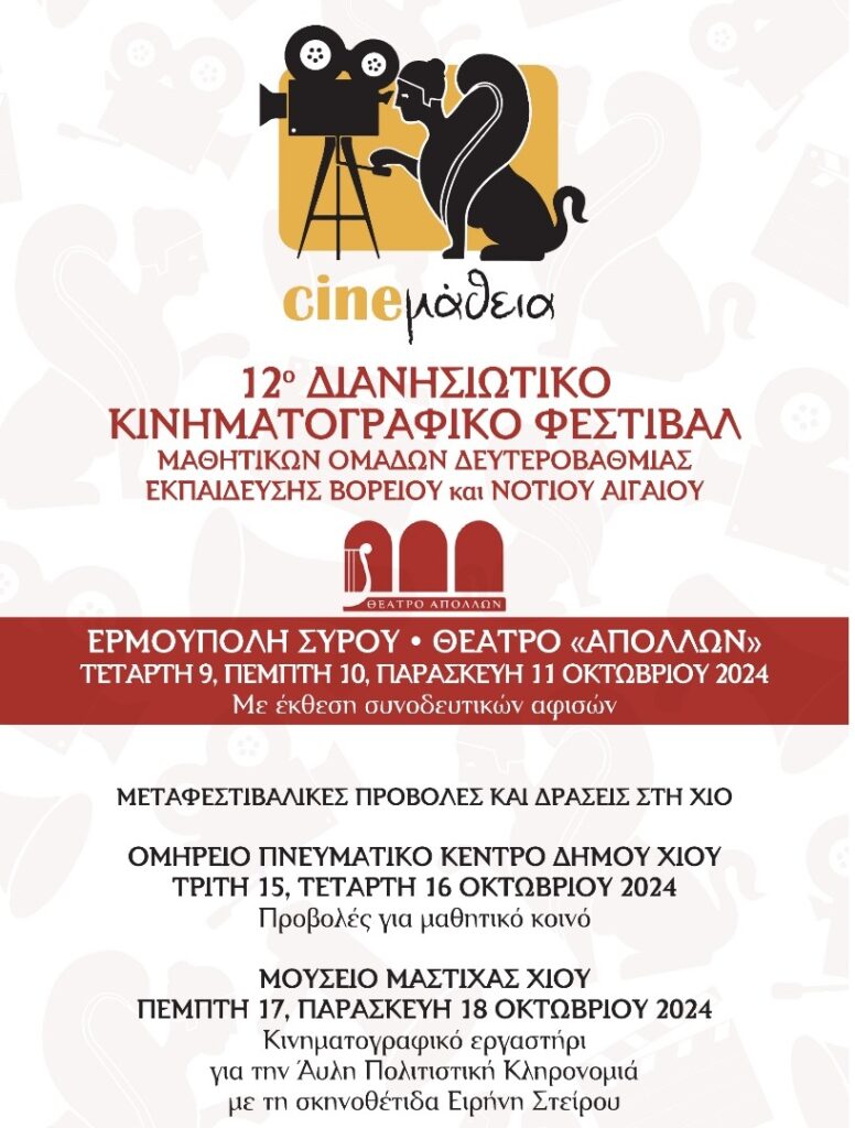 Από τις 9 έως και τις 11 Οκτωβρίου, το κυρίως Φεστιβάλ «CINEμάθεια» θα πραγματοποιηθεί στο εμβληματικό θέατρο ΑΠΟΛΛΩΝ, στην Ερμούπολη Σύρου, με παράλληλα εργαστήρια για την Άυλη Πολιτιστική Κληρονομιά και τη δημιουργία ταινιών στο σχολείο.
