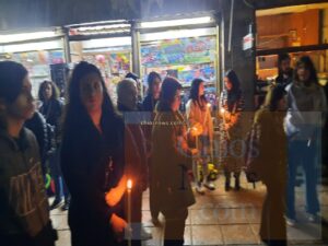 Λίγο πιο πέρα από την είσοδο της Απλωταριάς που ήταν η «σιωπηλή συγκέντρωση», στην εξέδρα της πλατείας ένα «ΓΙΑΤΙ» σχεδιασμένο με κεράκια…
