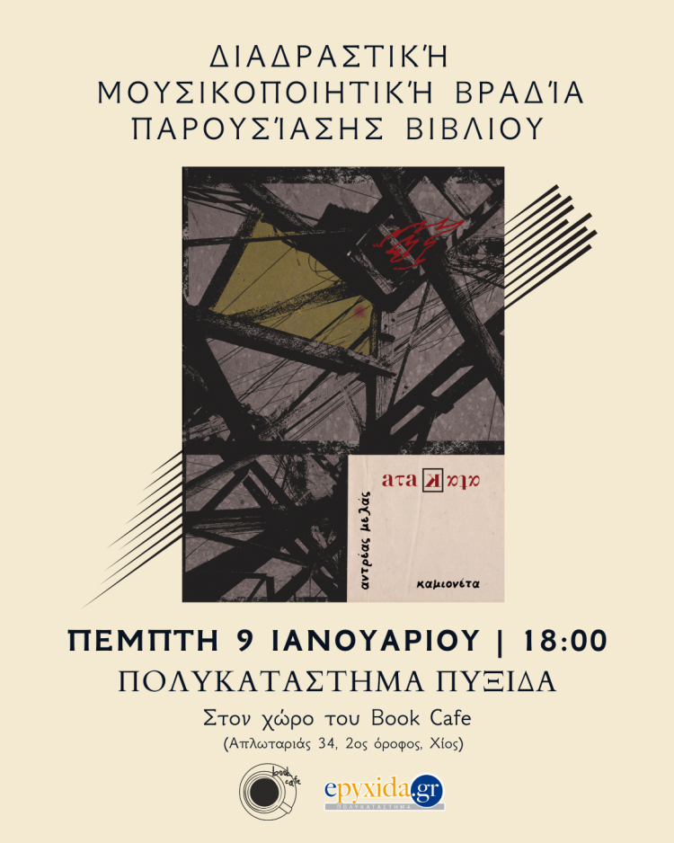 Μια διαδραστική μουσικοποιητική βραδιά με παρουσίαση του βιβλίου “aτaKαtα” του Αντρέα Μελά (εκδόσεις Καμιονέτα), θα πραγματοποιηθεί την Πέμπτη 9 Ιανουαρίου 2025, στις 6.00μ.μ., στο χώρο του Book Cafe του Πολυκαταστήματος Πυξίδα.