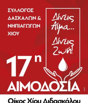Ο Σύλλογος Δασκάλων και Νηπιαγωγών Χίου διοργανώνει τη 17η κατά σειρά εθελοντική αιμοδοσία, το Σάββατο, 22 Μαΐου, από τις 9.00 το πρωί έως τις 13.30 μ.μ..
