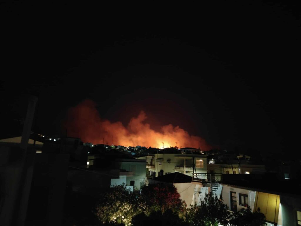 Εξακολουθεί να μαίνεται το ένα από τα πέντε πύρινα μέτωπα που ξέσπασαν το πρωί της Δευτέρας και κατευθύνεται προς τα Μαστιχοχώρια, προκαλώντας τεράστια ανησυχία στους κατοίκους της περιοχής. Η φωτιά εκτείνεται σε πολλά χιλιόμετρα και έχει ξεκινήσει από την περιοχή του Αγίου Γεωργίου Σικούση.