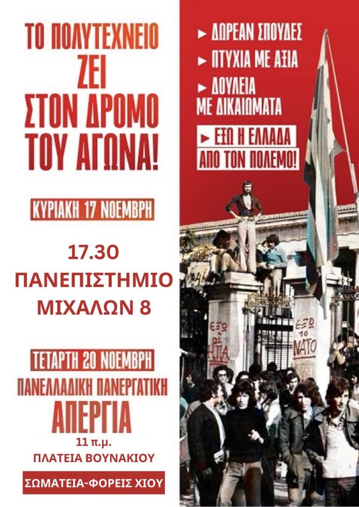 ΤΟ ΝΤ Χίου της ΑΔΕΔΥ καλεί τα σωματεία της δύναμης του να συμμετάσχουν μαζικά στη συγκέντρωση της Κυριακής 17 ΝΟΕΜΒΡΗ, στις 5.30 μ.μ. μπροστά από την πύλη του Πανεπιστημίου Αιγαίου, για να τιμήσουμε την 51η επέτειο της ηρωικής εξέγερσης των φοιτητών, των εργαζομένων και του λαού μας απέναντι στην Αμερικανοκίνητη Χούντα των συνταγματαρχών.