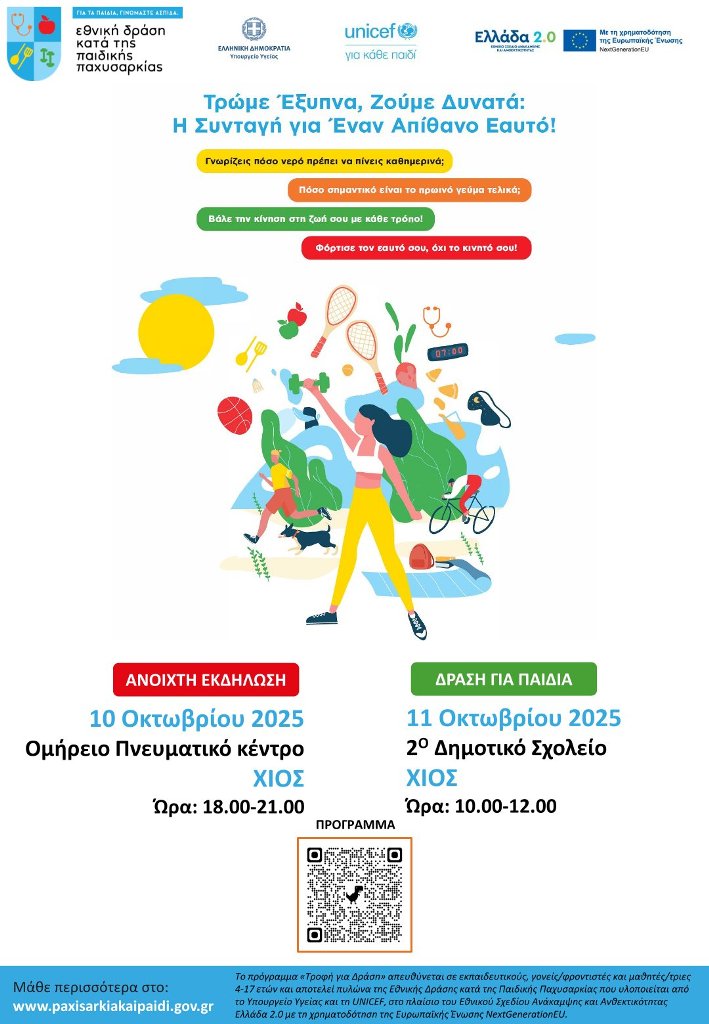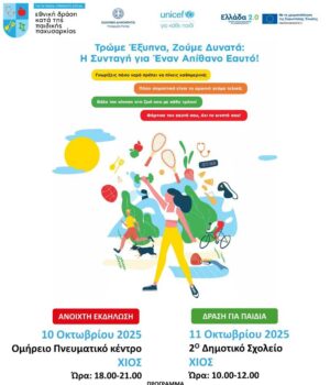Επίσης, το Σάββατο 11 Οκτωβρίου 2025, ώρα 10:00-12:00 το πρωί, θα πραγματοποιηθεί Δράση για παιδιά στο 2ο Δημοτικό Σχολείο Χίου, με παιχνίδια και βιωματικά εργαστήρια για παιδιά.