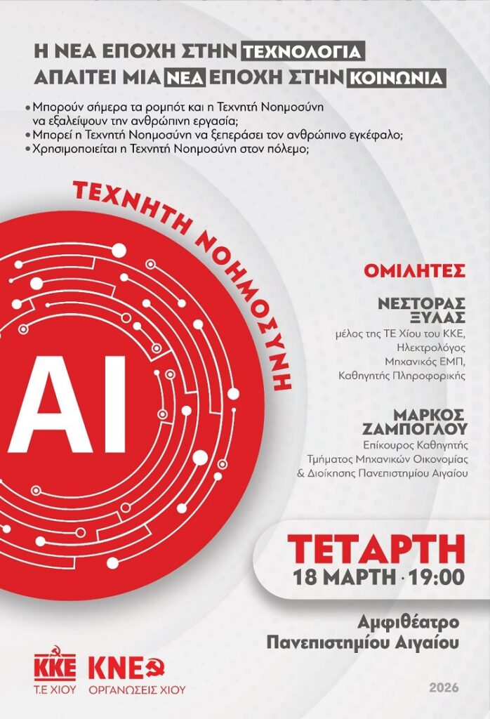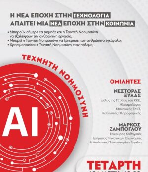 Την Τετάρτη 18 Μάρτη, στις 7.00 μ.μ., στο αμφιθέατρο του Πανεπιστημίου Αιγαίου “Γιάννης Καράλης”, πραγματοποιείται εκδήλωση με θέμα την τεχνητή νοημοσύνη.