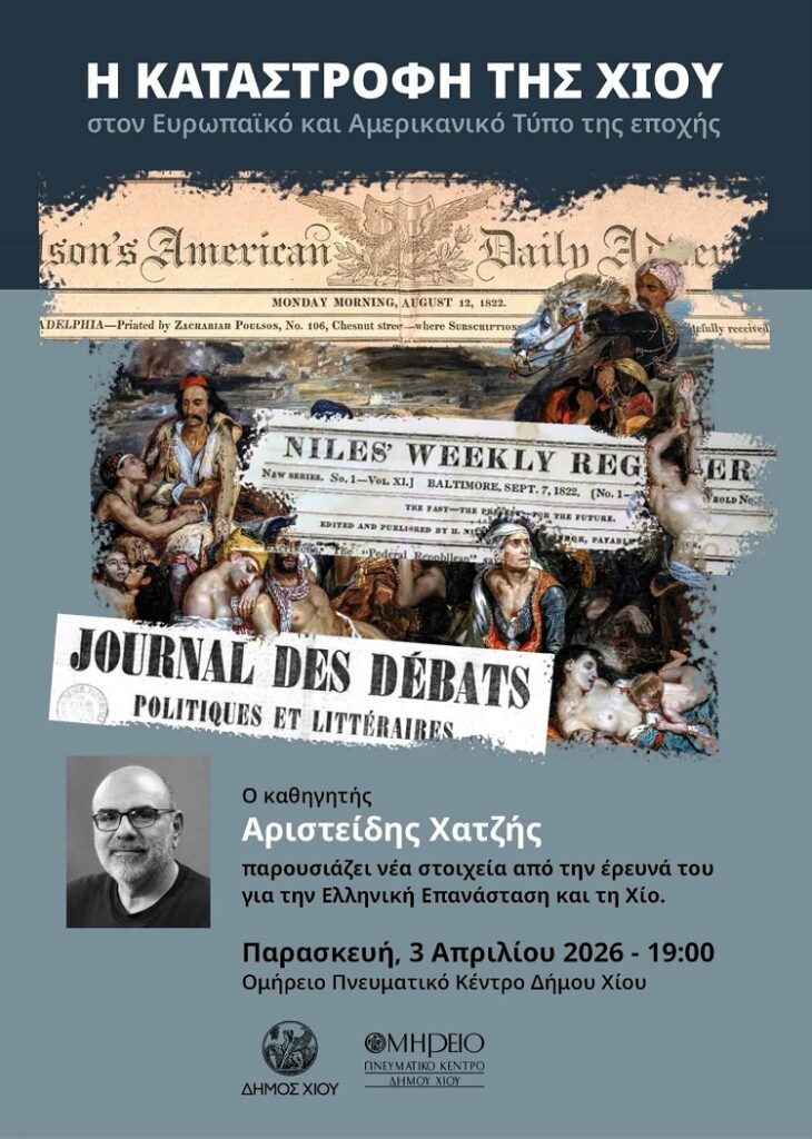 «Πρόκειται για μια διαφορετική οπτική, που αναδεικνύει πώς η τραγωδία της Χίου συγκλόνισε τον κόσμο και συνέβαλε στη διαμόρφωση του φιλελληνικού ρεύματος», σημειώνουν οι διοργανωτές που προσκαλούν την Παρασκευή, 3 Απριλίου 2026 στις 7.00 μ.μ. στο Ομήρειο Πνευματικό Κέντρο Δήμου Χίου.