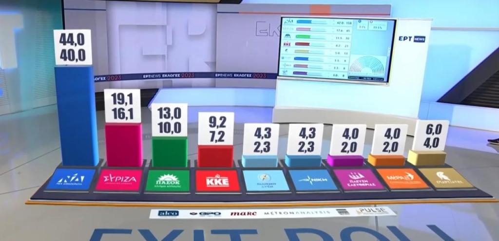 Σύμφωνα με το πρώτο exit poll που μετέδωσαν τα τηλεοπτικά κανάλια, η ΝΔ συγκεντρώνει από 40% έως 44% και ο ΣΥΡΙΖΑ-ΠΣ από 16,1% έως 19,1%, σίγουρη φαίνεται η είσοδος στη Βουλή των “Σπαρτιατών”.