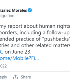 Η έκθεση του ειδικού εισηγητή του ΟΗΕ, Φελίπε Γκονθάλεθ Μοράλες, που θα παρουσιαστεί στα Ηνωμένα Έθνη σε δέκα μέρες, αφορά «τις παραβιάσεις των ανθρωπίνων δικαιωμάτων στα διεθνή σύνορα, τη σοβαρή και εκτεταμένη πρακτική των “επαναπροωθήσεων”, το ζήτημα των ασφαλών τρίτων χωρών και άλλα συναφή θέματα», όπως έγραψε ο ίδιος στο Twitter.