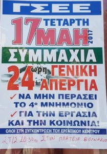 Κάλεσμα για τη γενική απεργία της Τετάρτης, 17 Μαΐου 2017, απηύθυνε το ΕΡΓΑΤΙΚΟ ΚΕΝΤΡΟ ΧΙΟΥ.