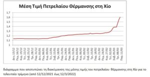 διάγραμμα που αποτυπώνει τη διακύμανση της μέσης τιμής του πετρελαίου θέρμανσης στη Χίο για το τελευταίο τρίμηνο (από 12/12/2021 έως 12/3/2022)
