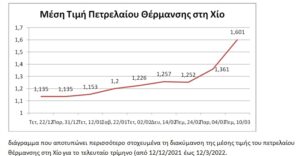 Επίσης τα ανωτέρω διαγράμματα θα έδιναν τη δυνατότητα να παρατηρήσουν-ανιχνεύσουν πως στα μέσα Ιανουαρίου του 2022 υπήρξε μια αύξηση της τιμής του πετρελαίου. Στις 22/1/2022 η τιμή πήγε στο 1,20€/lt (από το 1.135€/lt) και πριν τις 2/2/2022 που έληξε η σύμβαση με τον πρατηριούχο να είχαν προμηθεύσει τα σχολεία με πετρέλαιο και όχι να φτάσουμε την Παρασκευή 11/3/2022 να προμηθεύονται τα σχολεία το πετρέλαιο με 1,60€/lt. Το ότι η έλλειψη πετρελαίου στα σχολεία τον τελευταίο μήνα οφείλετε σε έναν κακό προγραμματισμό (αργοπορημένη διαπίστωση της λήξης της σύμβασης με τον προμηθευτή) επιβεβαιώνεται από το γεγονός ότι ούτε το Δημαρχείο είχε πετρέλαιο για να λειτουργήσει ο καυστήρας του την προηγούμενη εβδομάδας (αυτή που ολοκληρώθηκε στις 11/3/2022) και η θέρμανση του γινόταν με τα κλιματιστικά. Μήπως και αυτό που λέμε είναι ψέμας; Θα ήταν καλό να ήταν σήμερα εδώ και το σωματείο των εργαζομένων στον ΟΤΑ Χίου να το επιβεβαίωνε ή να έβγαζε σχετική ανακοίνωση.