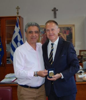Σε μια συμβολική κίνηση ο κ. Κάρμαντζης πρόσφερε στον κ. Marbot αναμνηστικό μετάλλιο με αναπαράσταση της κεφαλής της Χίας Κόρης (έργο του 4ου αιώνα π.Χ.).