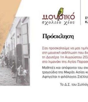 Ο Σύλλογος Γονέων / Κηδεμόνων του Μουσικού Σχολείου Χίου, διοργανώνει Μουσική Εκδήλωση τη Δευτέρα στις 1 Αυγούστου και ώρα 9.00 μ.μ., στο λιμανάκι της Αγίας Παρασκευής – Καστέλο.