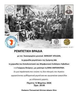 Συγκεκριμένα θα παρουσιαστεί η 40μελής Χορωδία Ρεμπέτικου της Σμύρνης (Izmir Rebetiko Korosu), υπό τη διεύθυνση του μαέστρου Berkant Atılgan.
