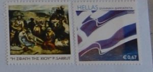 Στα γραμματόσημα απεικονίζονται μεταξύ άλλων ο πίνακας του Ντελακρουά ¨Η σφαγή της Χίου», το μνημείο στη Μέλαινα Ακρα, το μοναστήρι του Αγίου Μηνά, ο μπουρλοτιέρης Κωνσταντίνος Κανάρης.