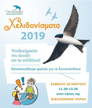 Η Ελληνική Ορνιθολογική Εταιρεία, η Βιβλιοθήκη Κοραή και το Εργαστήρι Περιβαλλοντικής Ευαισθητοποίησης «Βίωσε & Επιβίωσε» συνδιοργανώνουν το Σάββατο 30 Μαρτίου 2019, την πιο χαρούμενη γιορτή της άνοιξης, τα «Χελιδονίσματα».