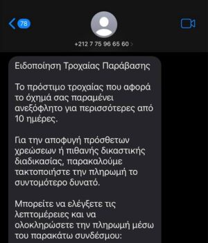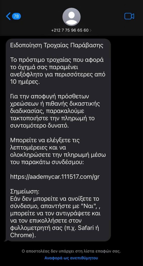 Ακόμη ένα παραπλανητικό μήνυμα εντοπίστηκε να διακινείται τις τελευταίες μέρες με το οποίο οι πολίτες ενημερώνονται για ληξιπρόθεσμη οφειλή συνεπεία τροχαίας παράβασης, η οποία πρέπει να εξοφληθεί προς αποφυγή πρόσθετων οικονομικών επιπτώσεων.