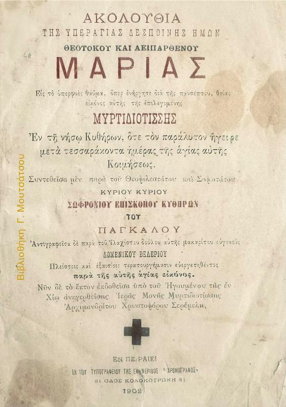 Το 1902 ο ηγούμενος και ιδρυτής της Μονής αρχιμανδρίτης Χρυστόφορος Σερέμελης στην προσπάθειά του συγκέντρωσης χρημάτων για την ανέγερση της Μονής, αποφάσισε και τύπωσε αυτό το φυλλάδιο 44 σελίδων με την ακολουθία της Θεοτόκου Μαρίας της επονομαζόμενης Μυρτιδιοτίσσης από το θαύμα ‘’ του γεγονότος εν τω πανσέπτω αυτής Ναώ των Μυρτιδίων εν τη Νήσω Κυθήρων ότε τον παράλυτον ήγειρε ‘’.
