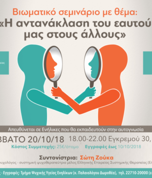 Βιωματικό εργαστήρι με θέμα «H αντανάκλαση του εαυτού μας στους άλλους», πραγματοποιείται από το Τμήμα Ψυχικής Υγείας Ενηλίκων του Κέντρου Παιδιού και Εφήβου, το Σάββατο 20/10/2018 – Ώρα: 18:00-22:00.