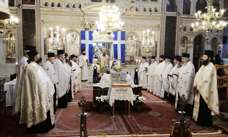 Σήμερον εορτήν του εν Αγίοις Πατρός ημών Διονυσίου Αιγίνης του εν Ζακύνθω, καθ’ ην ο μακαρία τη λήξει γενόμενος, Μητροπολίτης Διονύσιος, ήγεν τα ονομαστήρια αυτού, τη συμμετοχή σύμπαντος του Ιερού Κλήρου και πλήθους λαού,καθήκον και χρέος ιερόν συνεγκέντρωσεν πάντας ημάς εις τον Ιερόν τούτον Ναόν της Καθέδρας, δια να τελέσωμεν ιερόν μνημόσυνον, επί τη συμπληρώσει δέκα και πλέον ετών, από του θανάτου του και να αναπέμψωμεν ικεσίαν προς τον Οικτήρμονα Θεόν, υπέρ αναπαύσεως της μακαρίας ψυχής του.