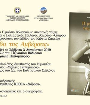 Το βιβλίο του Κώστα Ζαφείρη «Η μακαρονάδα της Αμβέρσας» θα παρουσιαστεί το Σάββατο 3 Αυγούστου στις 7.30 μ.μ. στο προαύλιο του Γυμνασίου Βολισσού “Μιχάλης Παπαμαύρος”.