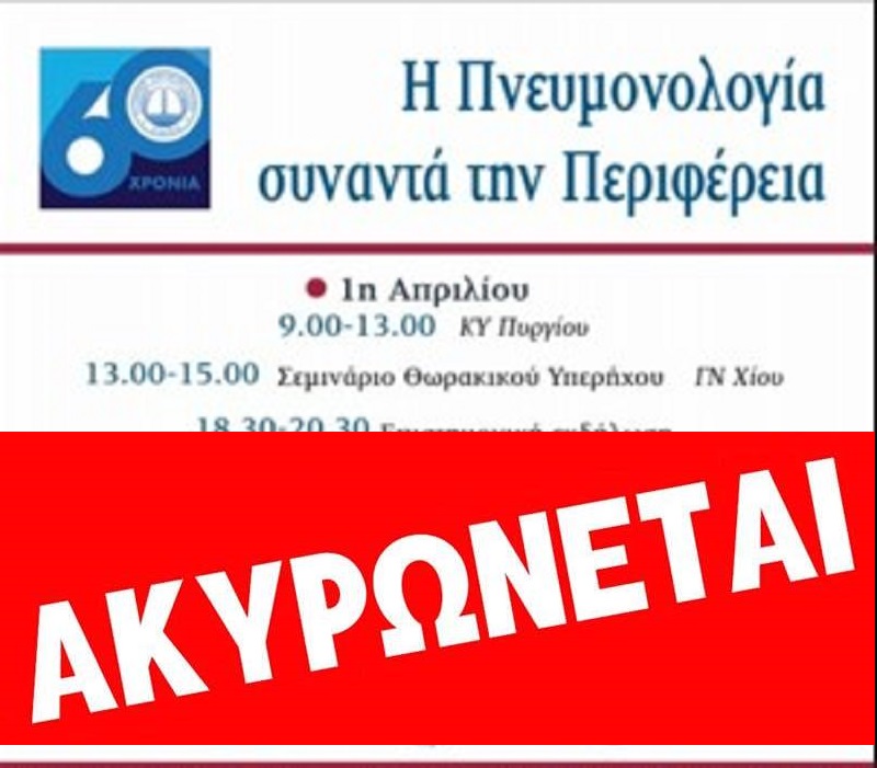 “Η προγραμματισμένη για σήμερα εκδήλωση της Ελληνικής Πνευμονολογικής Εταιρείας και του Ιατρικού Συλλόγου Χίου, στο Ομήρειο δεν θα πραγματοποιηθεί καθώς λόγω δυσμενών καιρικών συνθηκών δεν προσγειώθηκε η πτήση που μετέφερε τους ομιλητές και τα μέλη της Ελληνικής Πνευμονολογικής Εταιρείας”, αναφέρει σε ανακοίνωσή του ο Ιατρικός Σύλλογος Χίου.