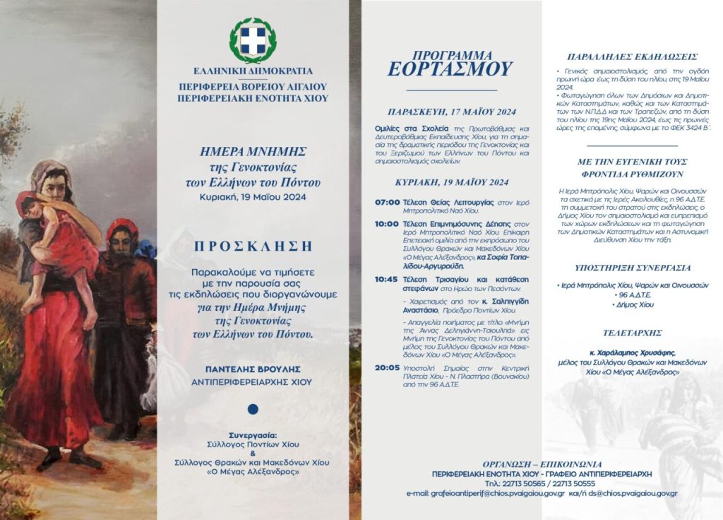 Αναγνωρίζοντας το χρέος και την υποχρέωση της η Περιφερειακή Ενότητα Χίου καλεί όλους τους Χιώτες να δώσουν το παρόν στις εκδηλώσεις Μνήμης που οργανώνει και φέτος σε συνεργασία με το Σύλλογο Ποντίων Χίου και το Σύλλογο Θρακών & Μακεδόνων Χίου «O Μέγας Αλέξανδρος», καθώς κρατούν άσβεστη την ιστορική μνήμη, τηρώντας παράλληλα τα ήθη και τα έθιμα της ιδιαίτερης πατρίδας τους.