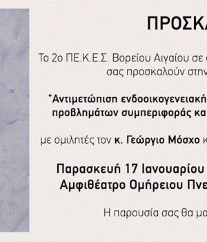 Ομιλία με θέμα: “Αντιμετώπιση ενδοοικογενειακής βίας, σχολικού εκφοβισμού, προβλημάτων συμπεριφοράς και παραβατικότητας μαθητών”, με εισηγητές τον Γιώργο Μόσχο (ο πρώτος Συνήγορος του Παιδιού) και την Εισαγγελέα Χίου Σπυριδούλα Σταυράτη, διοργανώνει το 2ο Περιφερειακό Κέντρο Εκπαιδευτικού Σχεδιασμού (ΠΕ.Κ.Ε.Σ.) Βορείου Αιγαίου σε συνεργασία με την Ε.Λ.Μ.Ε. Χίου.