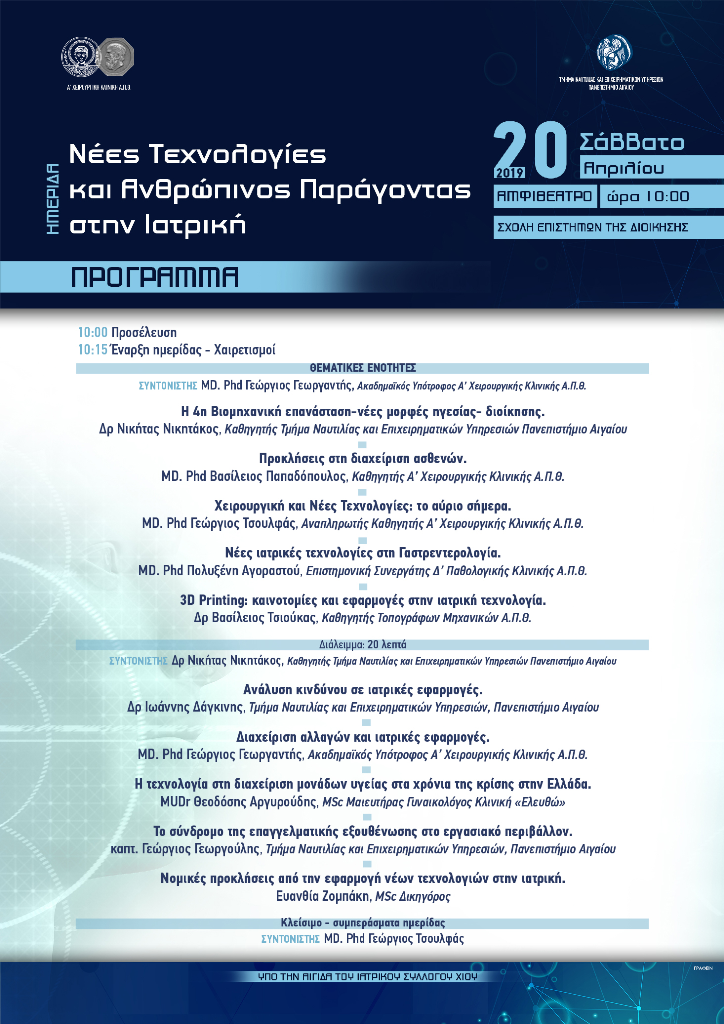 Ημερίδα με θέμα “Νέες τεχνολογίες και ανθρώπινος παράγοντας στην ιατρική” θα πραγματοποιηθεί στις 20 Απριλίου 2019 στο αμφιθέατρο του Πανεπιστημίου Αιγαίου στη Χίο στις 10.00 π.μ..