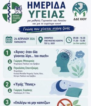 Την Παρασκευή 24/4/2026, από τις 9:00 – 10:30 το πρωί και από 11:30 – 13:00, ο Ιατρικός Σύλλογος Χίου μέσω τριών ομιλιών για το άγχος, τον ύπνο και το κάπνισμα θα ενημερώσει μαθητές Γυμνασίων και Λυκείων για αυτά τα σημαντικά θέματα υγείας.
