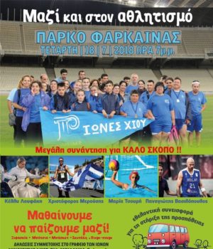 Συνδιοργανωτές στην εκδήλωση ήταν το Νομικό Πρόσωπο του Δήμου Χίου και η Περιφερειακή Ενότητα Χίου. Κοντά στους αθλητές βρέθηκαν πολύ γνωστά ονόματα, όπως η Κέλλυ Λουφάκη, πρωταθλήτρια στην ξιφασκία με αμαξίδιο, ο Μαραθωνοδρόμος Πρωταθλητής Χριστόφορος Μερούσης, ο πρώην διεθνής μπασκετμπολίστας Παναγιώτης Βασιλόπουλος και την επίσης πρώην διεθνή πολίστρια Μαρία Τσουρή, οι οποίοι έβγαλαν φωτογραφίες, έδωσαν αυτόγραφα και έπαιξαν μαζί με τον κόσμο που ήταν εκεί στον αθλητικό χώρο της Φάρκαινας. Τα παιχνίδια – αγωνίσματα, που μπορούσαν να συμμετέχουν όλοι, ήταν ξιφασκία με αμαξίδιο, σκυτάλη, μπάσκετ, μπότσια και πινγκ πονγκ. Έγιναν μίνι τουρνουά και τους νικητές δόθηκε σαν βραβείο το μπλουζάκι του συλλόγου! Η εκδήλωση εντασσόταν στην εκστρατεία «Βοήθησε κι εσύ να τρέξουν οι τροχοί», που στοχεύει στη συγκέντρωση χρημάτων για την αγορά του λεωφορείου, που τόσο έχει ανάγκη η ομάδα των “Ιώνων”. Κάπου εδώ ας μας επιτραπεί να φωνάξουμε λίγο, έλεος, τα παιδιά αυτά – οι αθλητές του Σωματείου ΙΩΝΕΣ δεν έχουν μεταφορικό μέσον για αρκετούς μήνες τώρα γιατί το παλιό τους χάλασε. Ας συγκινηθεί κανένας αρμόδιος ή μη… και ας πάρει το λεωφορείο αυτό. Για όνομα του Θεού πια. Ενώ στο «Κ» μίλησαν γι’αυτή την προσπάθεια η πρωταθλήτρια Κ. Λουφάκη και ο επίσης πρωταθλητής Χ. Μερούσης. Η πρώτη μας είπε τα εξής: «Με μεγάλη μου χαρά συμμετείχα στην εκδήλωση που έγινε για καλό σκοπό. Είναι πολύ σημαντικό να έχουν όλοι δικαίωμα στον αθλητισμό και ειδικά τα παιδιά. Εύχομαι να καταφέρουμε να «τρέξουν οι τροχοί».» Ο δεύτερος μας ανάφερε: «Την Τετάρτη ήμασταν εκεί για να στηρίξουμε τις προσπάθειες των παιδιών και να μοιραστούμε την χαρά τους! Προσπαθούμε όλοι μαζί για τον κοινό καλό σκοπό!»