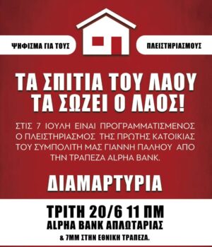 Μόνο η μαζική λαϊκή πάλη μπορεί να σώσει τα σπίτια του λαού και να το ξαναπούμε όσοι από εμάς κινδυνεύουμε να χάσουμε το σπίτι μας: