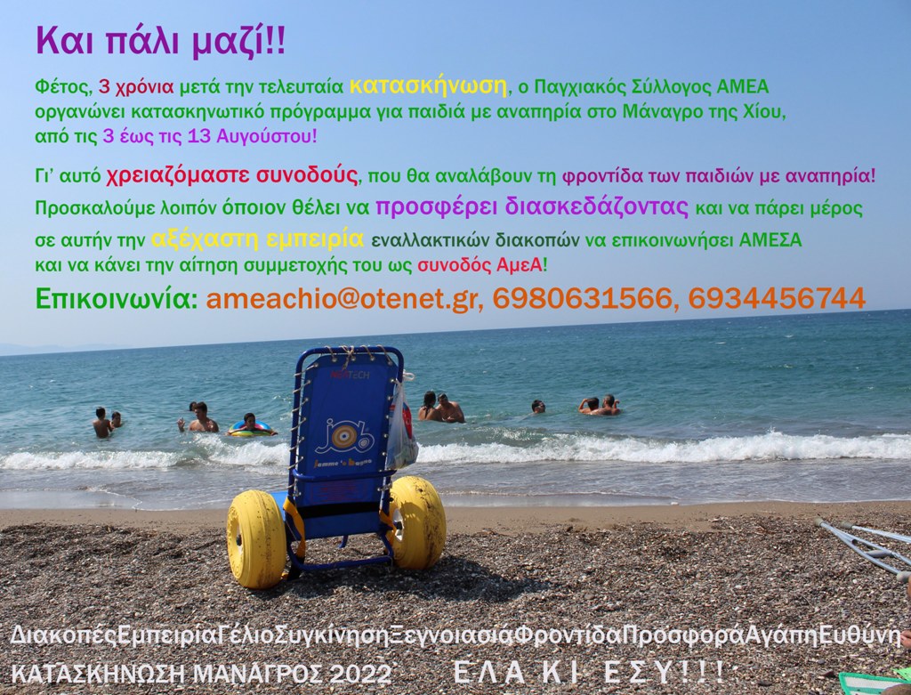 Κατασκηνωτικό Πρόγραμμα για Ατομα με αναπηρία, διοργανώνει μετά από 3 καλοκαίρια ο Παγχιακός Σύλλογος ΑμεΑ και ο Σύλλογος Γονέων & Κηδεμόνων ΑμεΑ Νομού Χίου. Στον κατασκηνωτικό χώρο των προσκόπων στην παραλία “Μάναγρος” στη Βόρεια Χίου η κατασκήνωση θα πραγματοποιηθεί από 2 έως και 13 Αυγούστου.