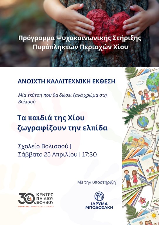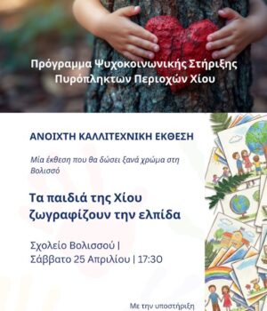 Ανοιχτή καλλιτεχνική έκθεση με τίτλο «Τα παιδιά της Χίου ζωγραφίζουν την ελπίδα», θα πραγματοποιηθεί το Σάββατο 25 Απριλίου 2026, στις 5.30 μ.μ., στο Σχολείο της Βολισσού.