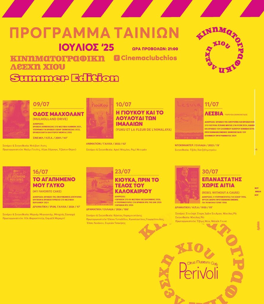 Αυτήν την εβδομάδα η Κινηματογραφική Λέσχη Χίου έχει προγραμματίσει ένα τριήμερο προβολών στο φιλόξενο χώρο του κτήματος ‘PERIVOLI’ στον Κάμπο.