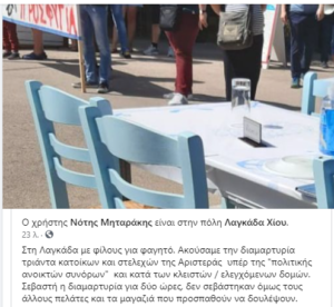 Σύμφωνα με πληροφορίες ενημερώθηκαν ότι πρόκειται να επισκεφθεί το χωριό, και συγκεκριμένα ταβέρνα στην παραλιακή ζώνη της Λαγκάδας, ο υπουργός Μετανάστευσης και Ασύλου Νότης Μηταράκης και έτσι υπήρξε άμεση κινητοποίηση.