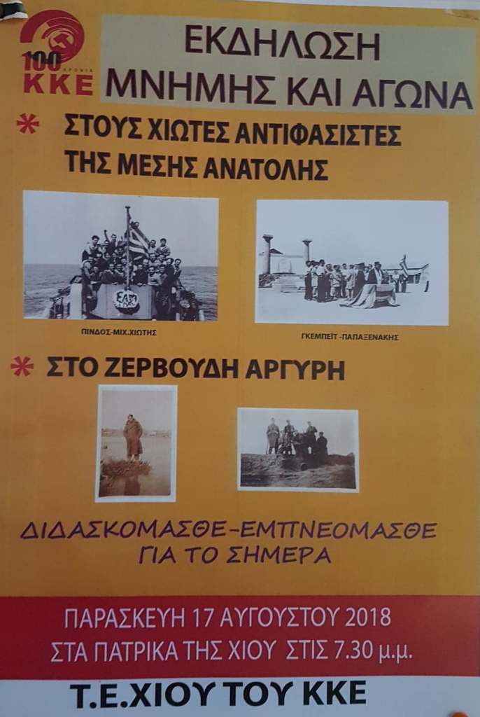 Παράλληλα να τιμήσουμε τον συναγωνιστή «συρματένιο» ΑΡΓΥΡΗ ΖΕΡΒΟΥΔΗ», αλλά και όλους του Χιώτες «Συρματένιους» Αγωνιστές» που πέραν από τους αγώνες του στην Μ.Α. , μας έδωκαν την ευκαιρία, να οπλιστούμε με συμπεράσματα για τους αγώνες του σήμερα και του αύριο», καταλήγει η ανακοίνωση της ΤΕ Χίου του ΚΚΕ.