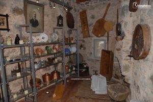 – Οικιακά σκεύη: σανίδι επεξεργασίας ζύμης, σινί ή αλλιώς ταψί χάλκινο, τυροβόλια (φόρμες για την παρασκευή τυριού), ξύλινα σκεύη παρασκευής ψωμιού (πλασταριές, πινακωτή και φουρνεύτιο), σικλί, αντικείμενα επεξεργασίας καφέ, καβουρδιστήρι και χάλκινος μύλος άλεσης καφέ, μπουρνιάς (πήλινο δοχείο για ρακί) κ.ά.