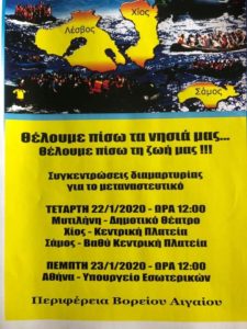 Ακόμα είναι απαράδεκτη η αφίσα που κυκλοφόρησε και στοχοποιεί τα θύματα και όχι τους θύτες και τους υπεύθυνους του μαζικού εγκλωβισμού στα νησιά μας. Ενώ το σύνθημα «θέλουμε τη ζωές μας, θέλουμε τα νησιά μας» αφήνει περιθώρια να αξιοποιηθεί από αντιδραστικές δυνάμεις χύνοντας το ρατσιστικό δηλητήριο τους