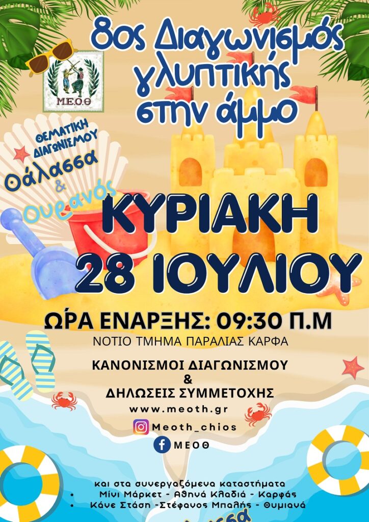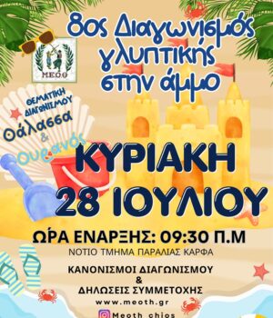 Ο Μορφωτικός Εκπολιτιστικός Όμιλος Θυμιανών διοργανώνει τον 8ο ΔΙΑΓΩΝΙΣΜΟ ΓΛΥΠΤΙΚΗΣ ΣΤΗΝ ΑΜΜΟ την Κυριακή 28 Ιουλίου του 2024, στο νότιο τμήμα της παραλίας του Καρφά.