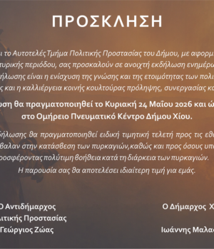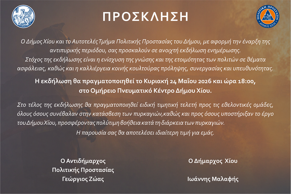Η προγραμματισμένη για το Σάββατο 2 Μαΐου 2026, εκδήλωση ενημέρωσης του Δήμου Χίου σχετικά με θέματα Πολιτικής Προστασίας μετατίθεται για την Κυριακή 24 Μαΐου 2026 και ώρα 6.00 μ.μ. στο Ομήρειο Πνευματικό Κέντρο Δήμου Χίου.