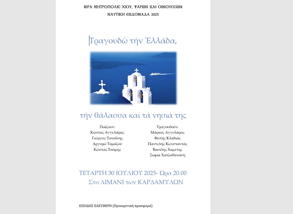 «Τραγουδώ την Ελλάδα, την θάλασσα και τα νησιά της», είναι ο τίτλος της συναυλίας που διοργανώνει η Ιερά Μητρόπολη Χίου, Ψαρών και Οινουσσών στα πλαίσια των εκδηλώσεων για την Ναυτική Εβδομάδα 2025..