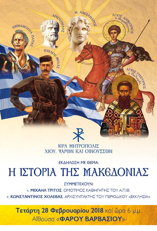 Εκδήλωση πραγματοποιεί η Ιερά Μητρόπολη Χίου με θέμα: «Η ΙΣΤΟΡΙΑ ΤΗΣ ΜΑΚΕΔΟΝΙΑΣ», την Τετάρτη 28 Φεβρουαρίου στις 6.00 μ.μ. στην αίθουσα του Φάρου Βαρβασίου.